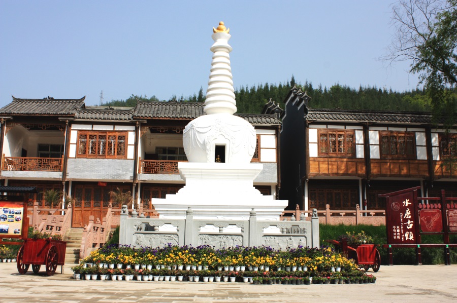 白塔藏语音译为“曲登嘎布”,亦称“吉祥白塔”。塔身外形如藻瓶,粗细相间,方圆搭配,造型优美。水磨白塔是古印度教及藏教东渐的实物佐证,亦是历史上民族团结和文化交流的物证,表达了各民族人民对和平、幸福的虔诚祈愿。